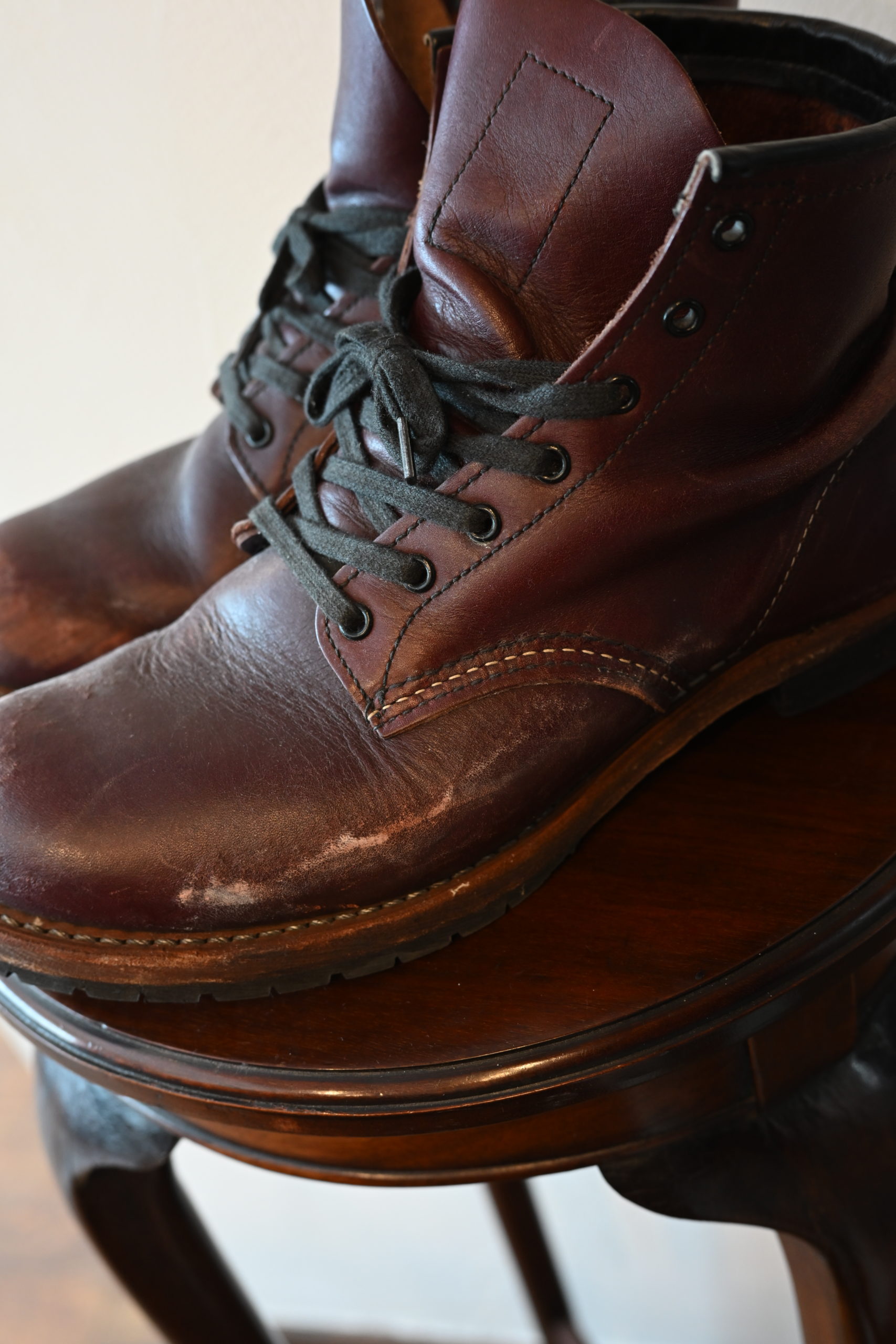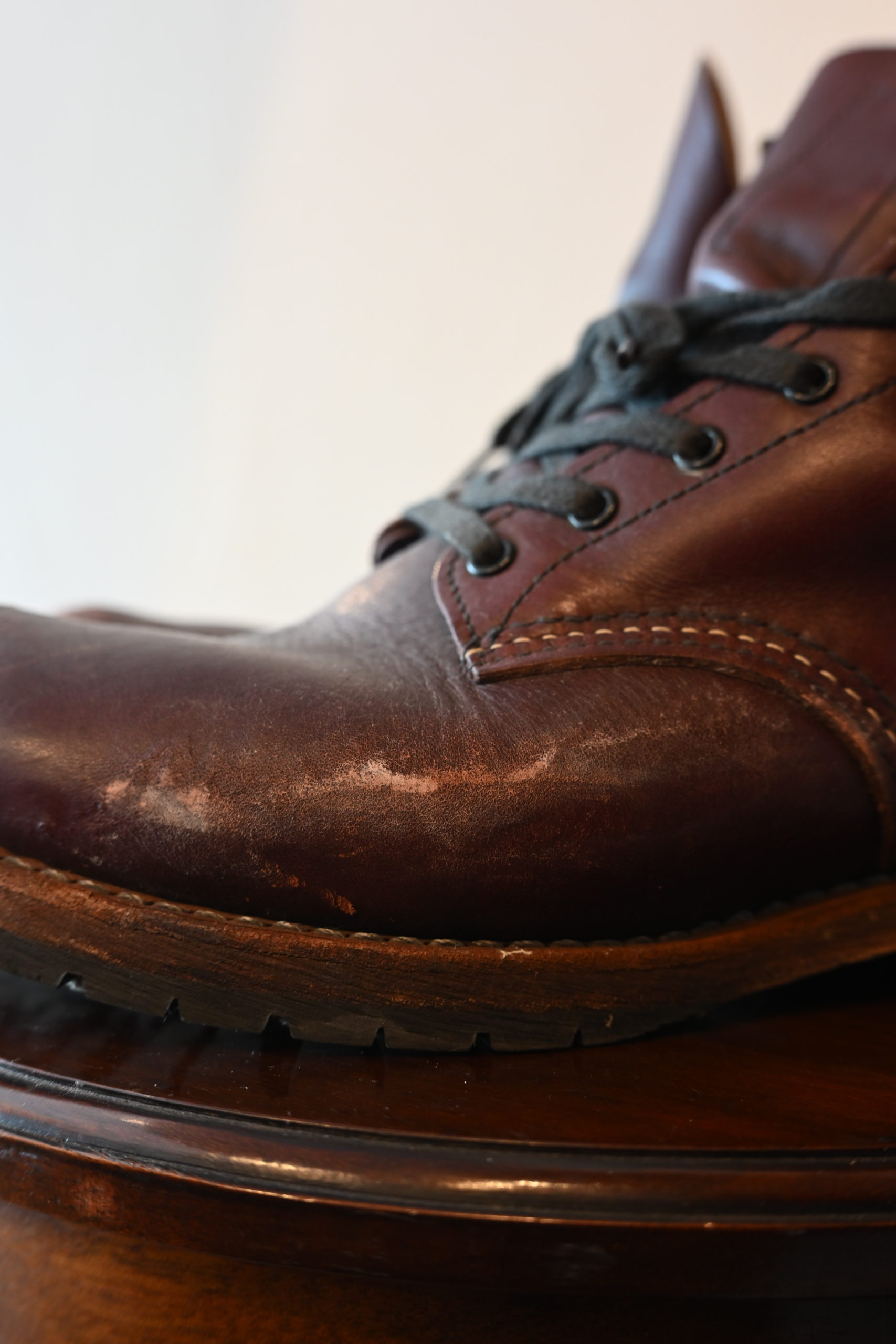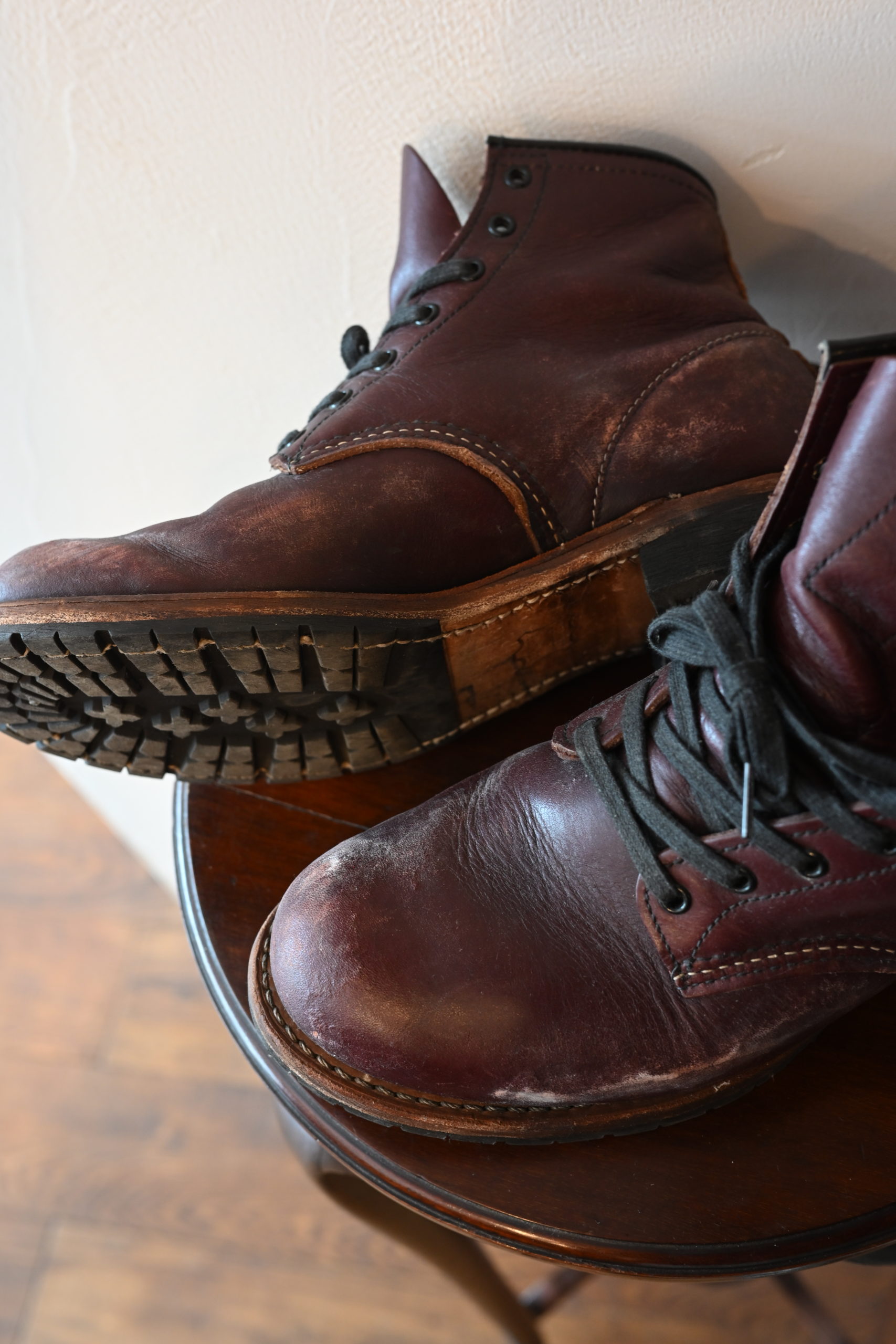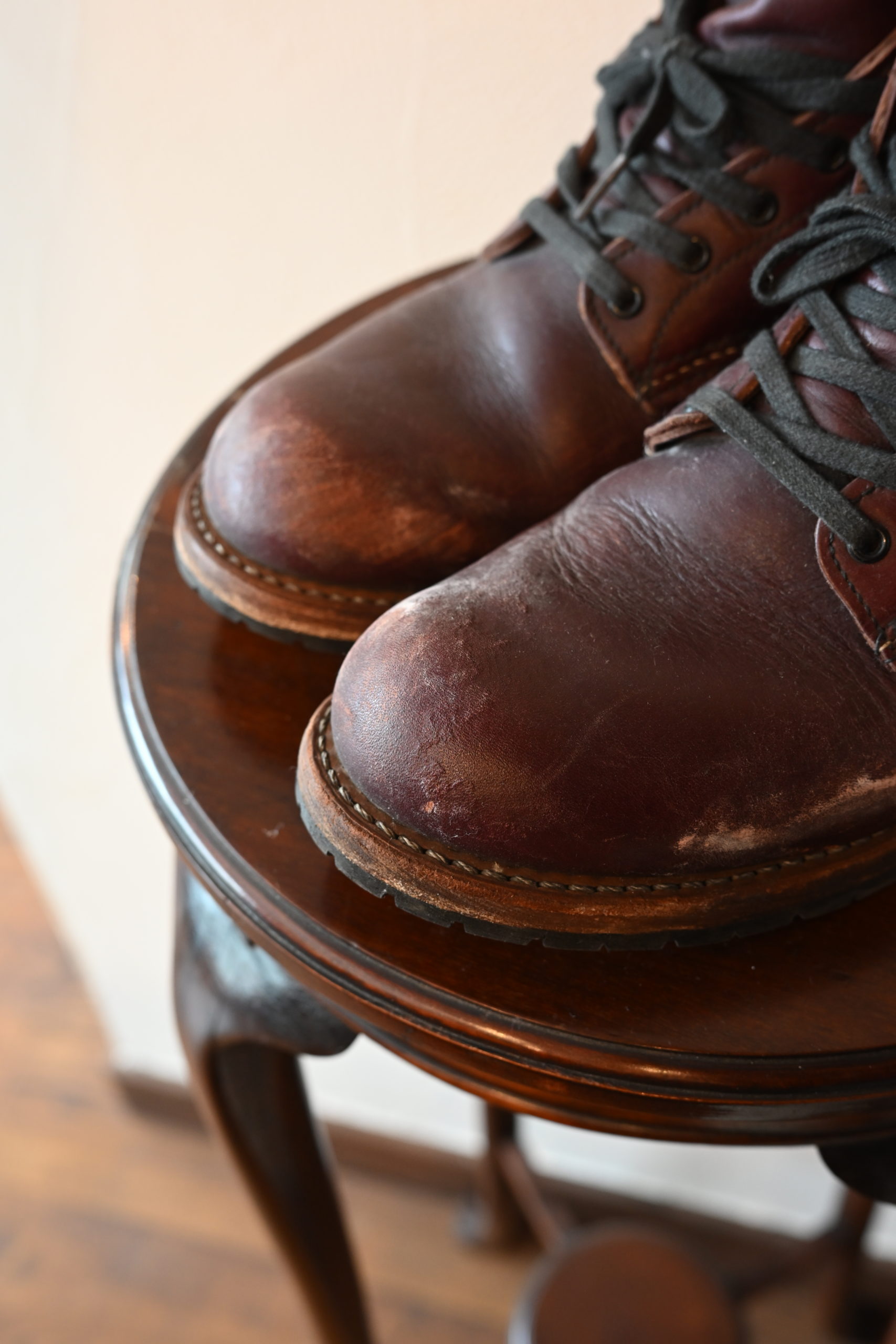 「塩ふき」…靴の中でかいた汗が革に染み込み、濡れた靴が乾く時に水分と一緒に表面に上がってきて、乾き切った時に塩だけが表面に残った状態。